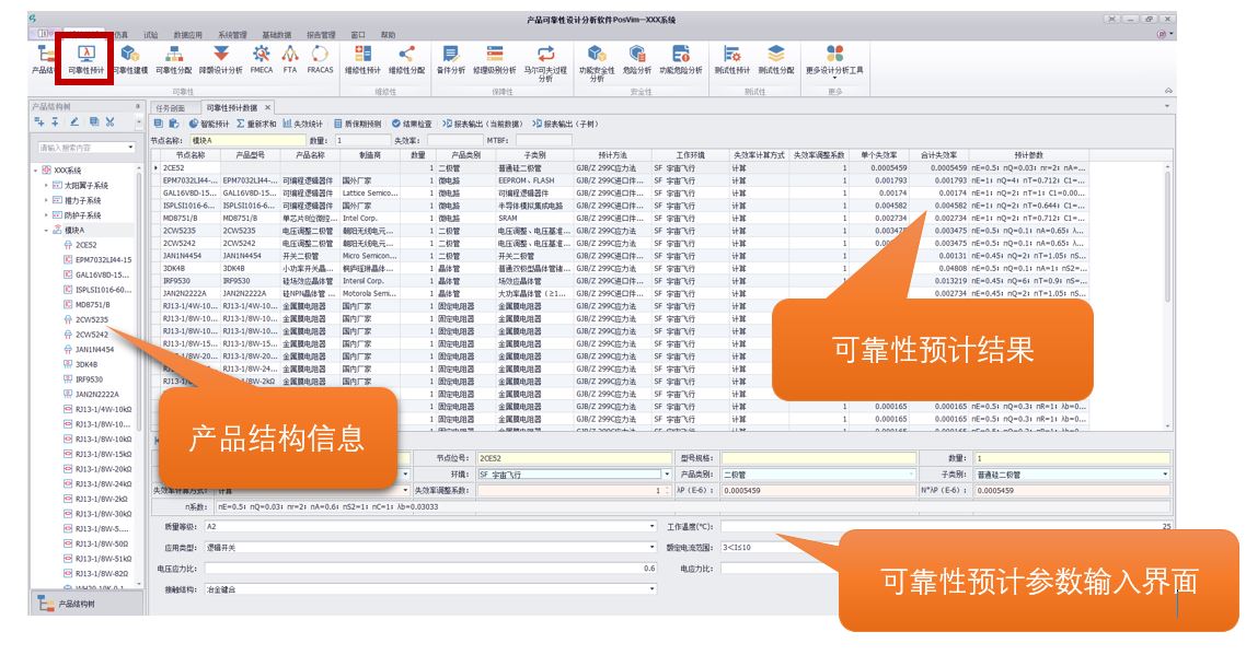 步驟6: 按照同樣的操作方法,完成模塊A和模塊B下的元件可靠性預(yù)計(jì)。即可得到模塊A和模塊B的可靠性預(yù)計(jì)結(jié)果。要查看根節(jié)點(diǎn)“XXX系統(tǒng)”的可靠性預(yù)計(jì)結(jié)果,在左邊的產(chǎn)品結(jié)構(gòu)樹(shù)界面點(diǎn)擊“XXX系統(tǒng)”即可看到。若沒(méi)看到結(jié)果,選中“XXX系統(tǒng)”后,點(diǎn)擊工具欄上方的