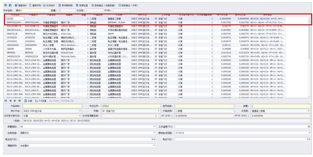 步驟2:在軟件界面的中間部分的節(jié)點(diǎn)列表中,雙擊需要進(jìn)行可靠性預(yù)計(jì)的節(jié)點(diǎn)。例如,雙擊“2CE52”節(jié)點(diǎn),下方彈出該節(jié)點(diǎn)需要輸入的可靠性預(yù)計(jì)參數(shù)。