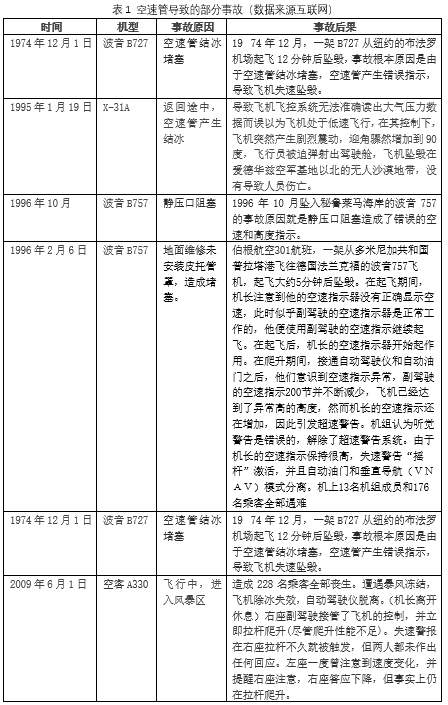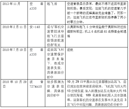 1974年至今,部分由于空速管故障造成的事故,如下表所示。