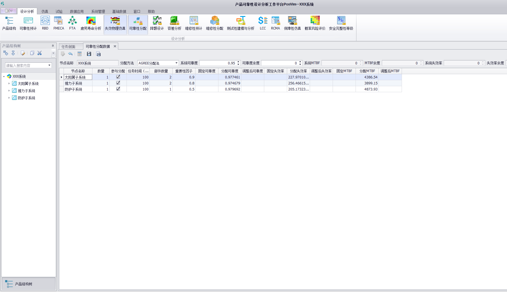 Reliability Design and Analysis Software PosVim. It is a platform for functions, performance, reliability, maintainability, supportability, testability, safety, environmental adaptability integrated design and analysis. The platform includes four sub-platforms, including design and analysis sub-platform, simulation sub-platform, test and verification sub-platform, and data mining application sub-platform. Among them, design and analysis sub-platform includes reliability prediction, reliability modeling, failure mode affect and critical analysis FMECA, FTA, fatigue life analysis, failure physics POF analysis and other functional modules; simulation sub-platform includes multi-physical environment simulation, reliability simulation, supportability simulation; test and verification sub-platform, including accelerated life test design, accelerated degradation test design, test sample optimization design, small sample test design, Bayesian test validation design, component test design, reliability test design of complex systems and complex networks; Data mining application sub-platform, including warrant prediction analysis, Weibull analysis,etc.