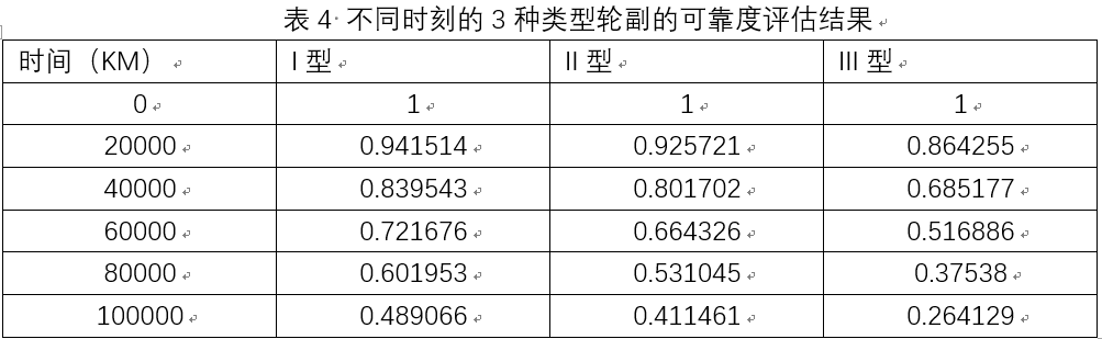 根據三類輪副的分布參數(shù)擬合結果,利用PosVim工具的威布爾分析模塊分別計算不同時間(這里使用Km為單位)的可靠度。計算結果如下表所示。從結果可知,當列車運行時間達到40000Km時,類型I的輪副可靠度為0.8395(即有0.8395的概率不會失效),類型II的輪副可靠度為0.8017,類型III的輪副可靠度只有0.6851。